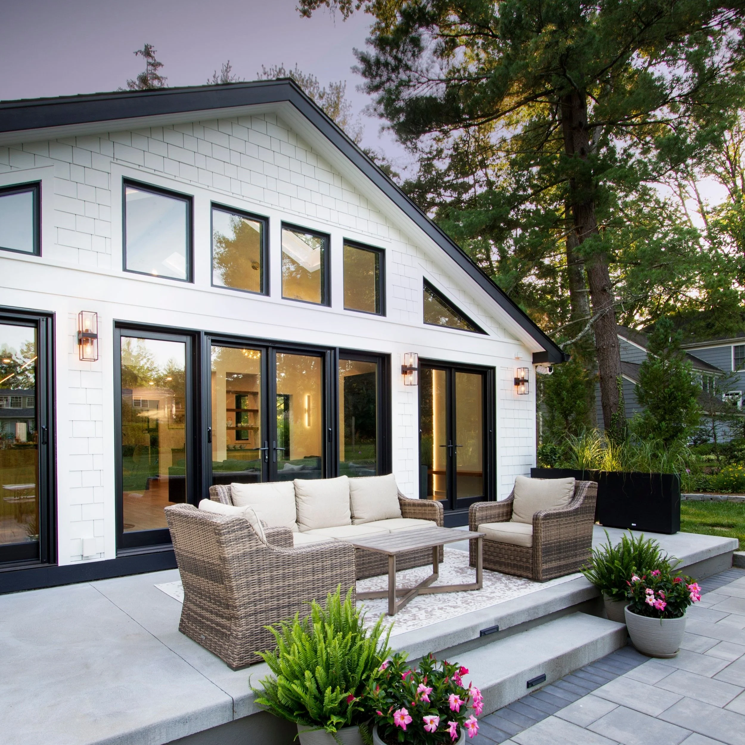 The original dark split-level house was transformed into a light-filled gathering place for family and friends. The expanded kitchen and living space connect to the expansive and verdant garden. Large windows and doors bring natural light deep into the interior, so it is a wonderful space to live in all year round. Naturally enhanced wood paneling, walnut cabinets and concrete countertops add a feeling of modern warmth.